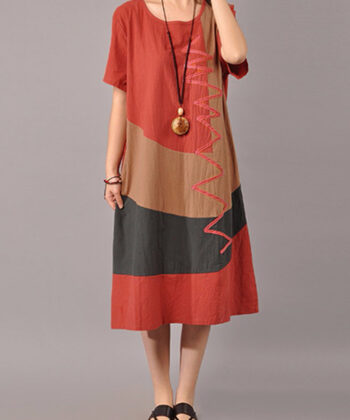 S-5XL Women Casual Short Sleeve Splice Loose O-neck Mid Long Dress