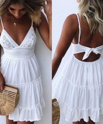 Summer Women Summer Dress Sexy Bow Backless V-neck Mini Beach Dresses Sleeveless Mini Ruffle White Summer Beach Dress